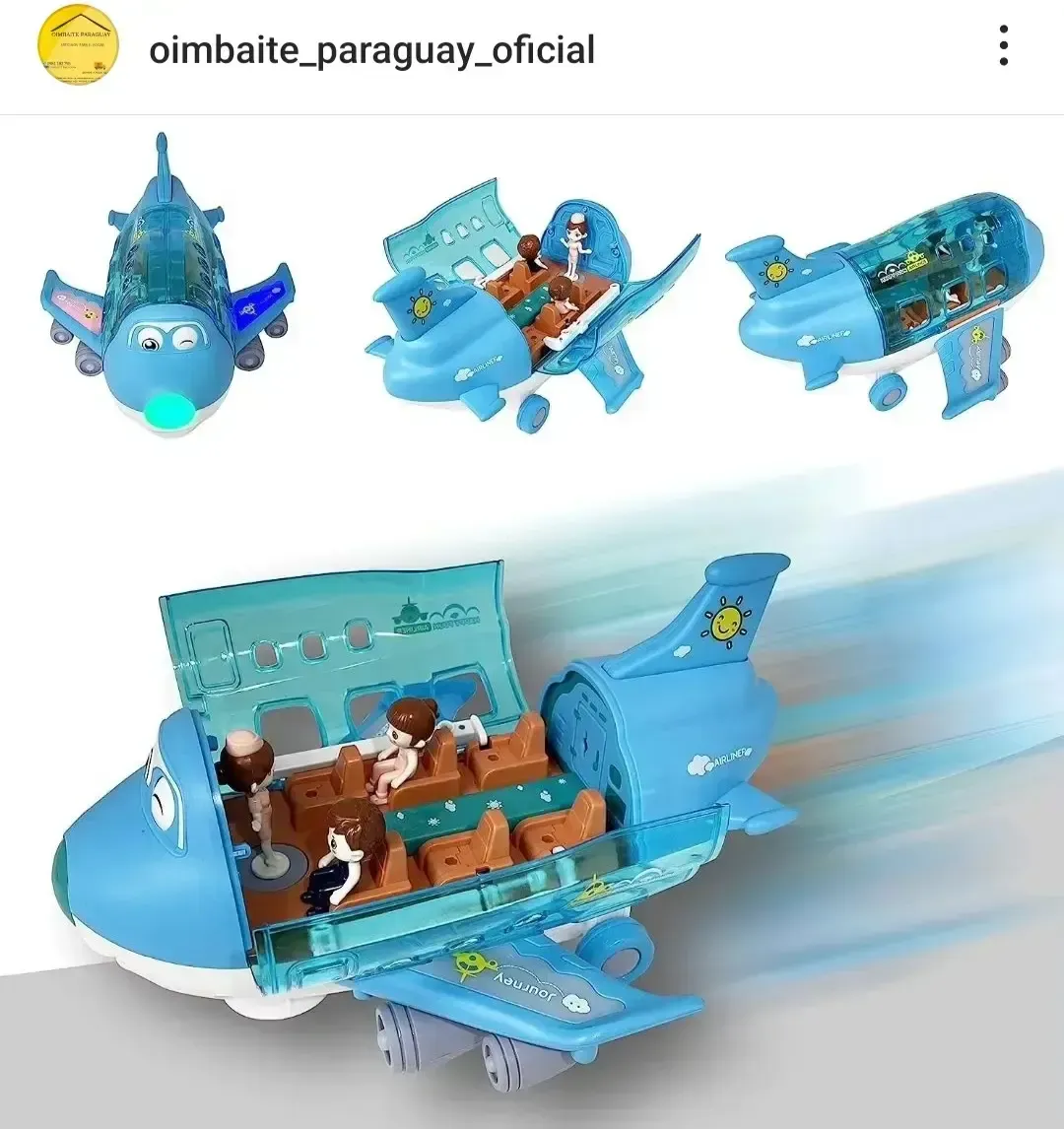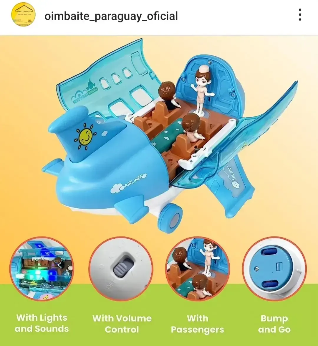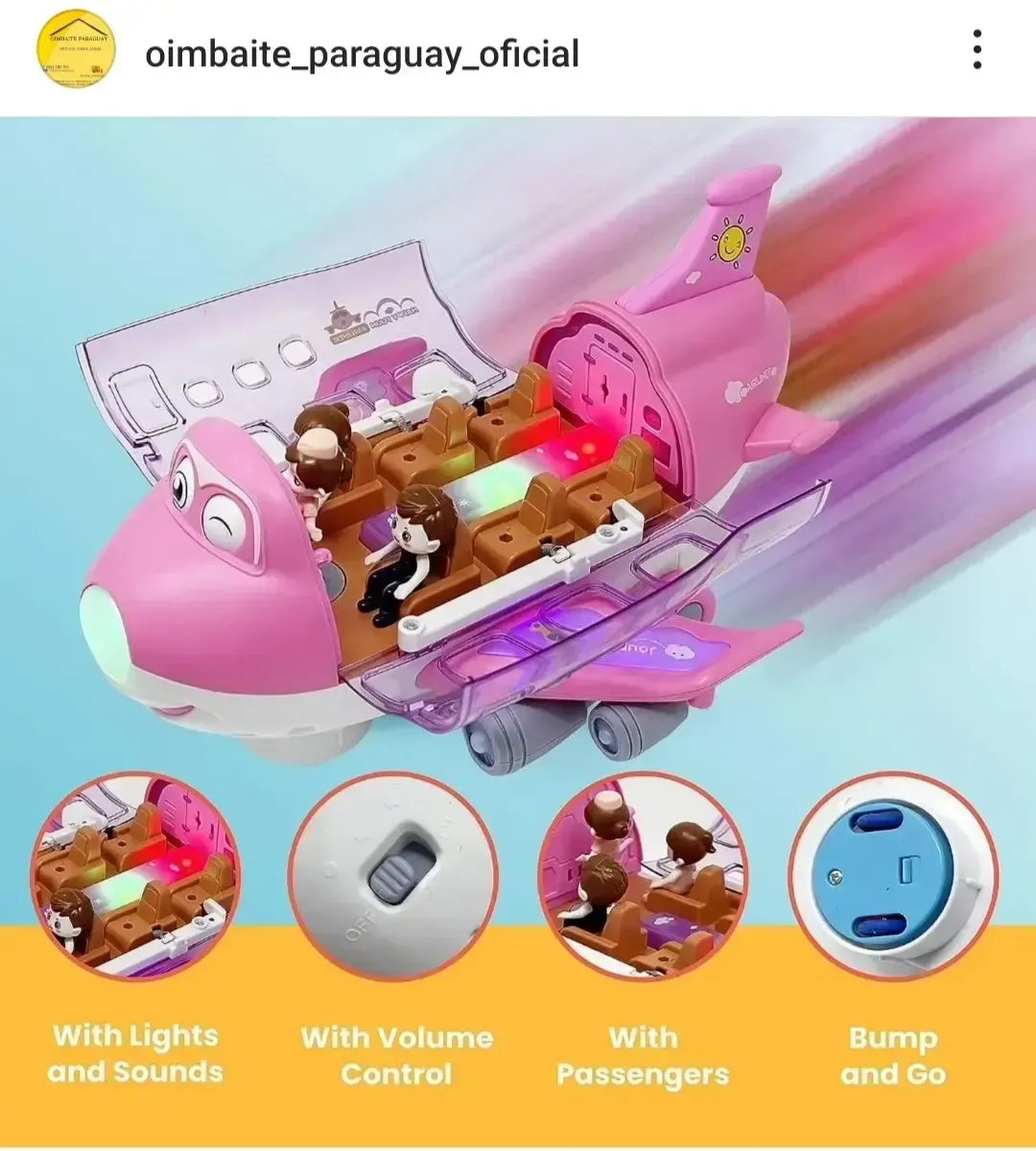 Juguete avión con 2 pasajeros y 1 azafata, con luces y música.