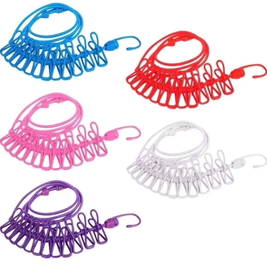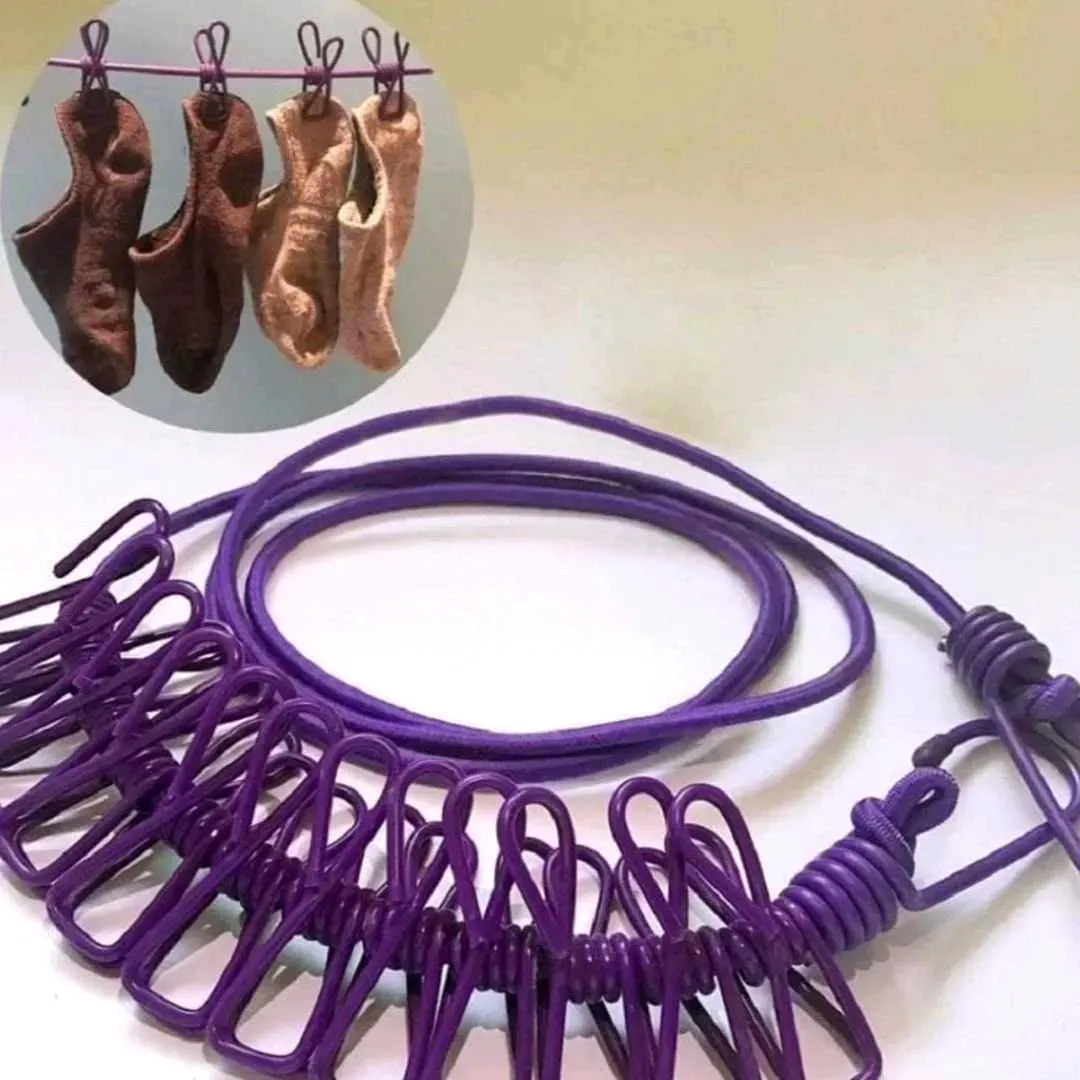Cuerda elástica de aproximadamente 3.20m con 12 pinzas de metal incluídas.