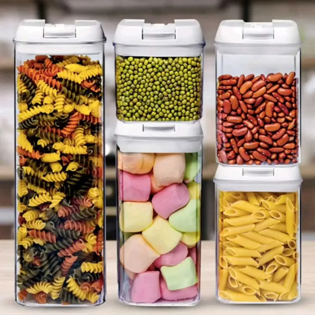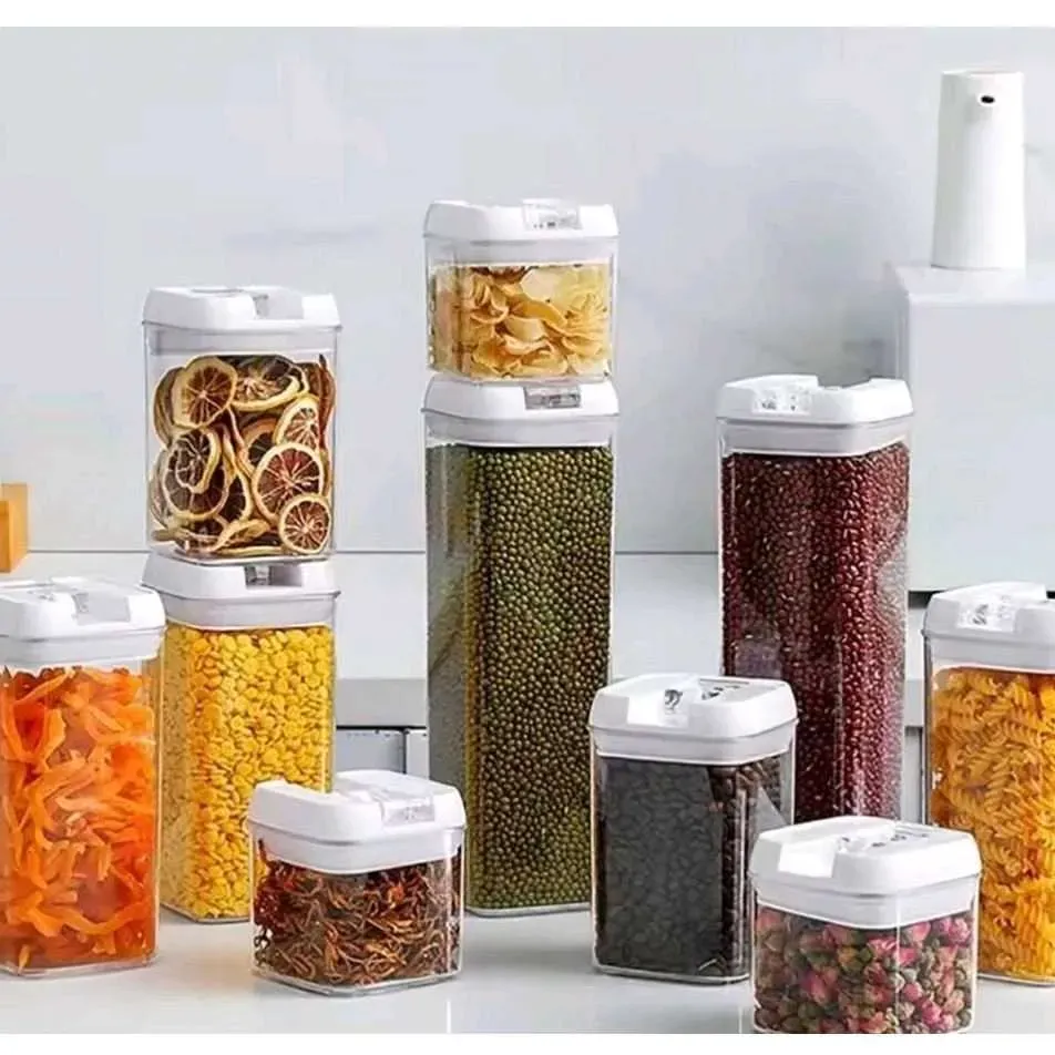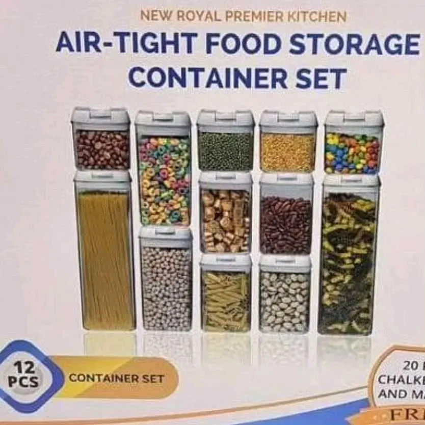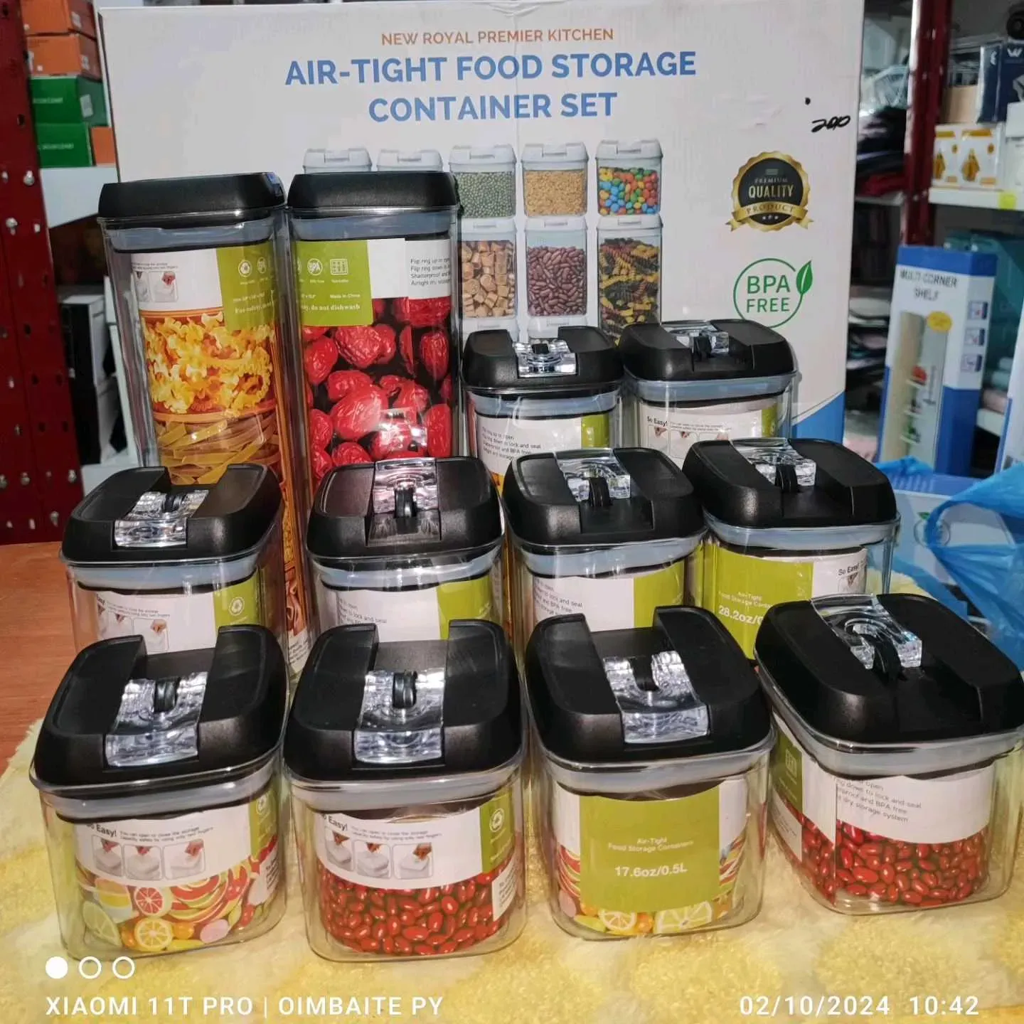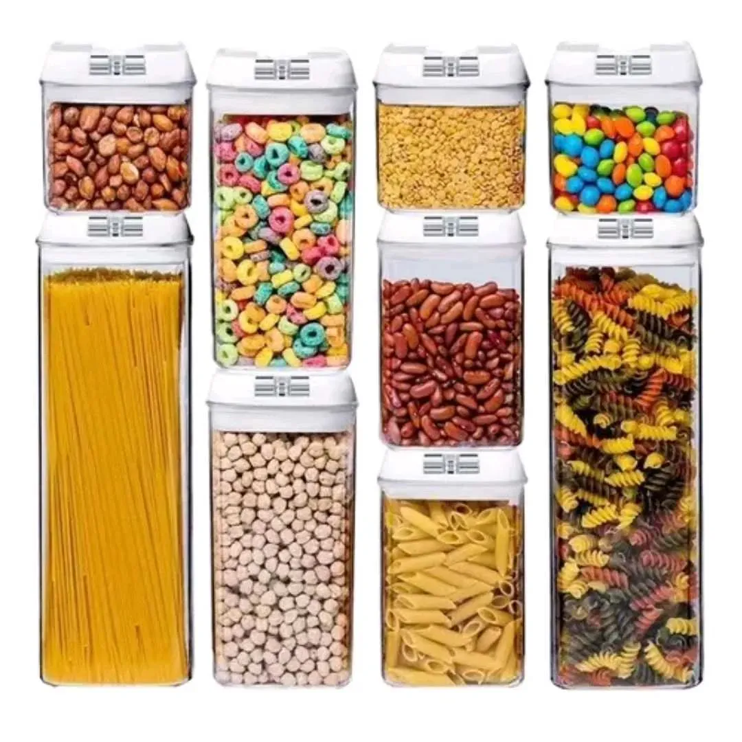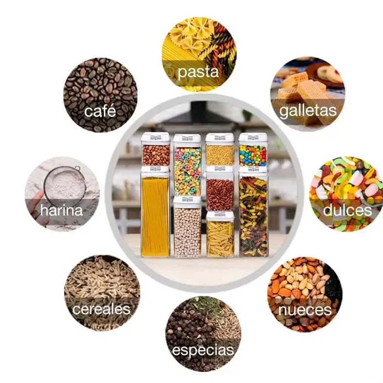 Juego de 12 contenedores acrílicos con tapas herméticas en diferentes tamaños para guardar cereales, granos, pastas, dulces, etc.