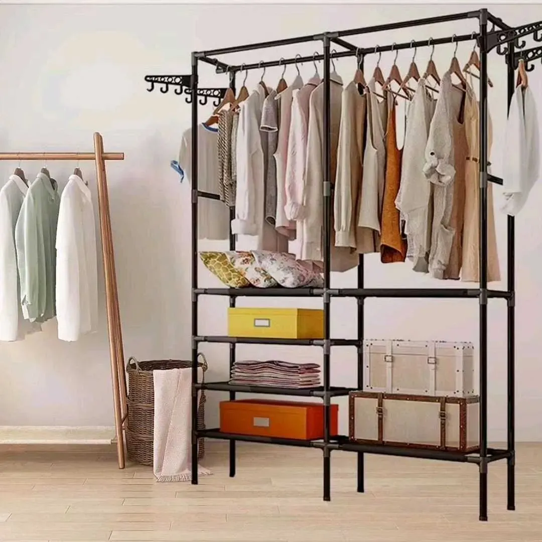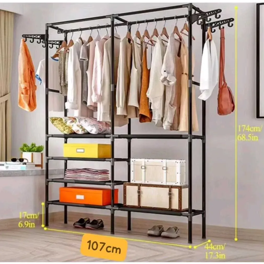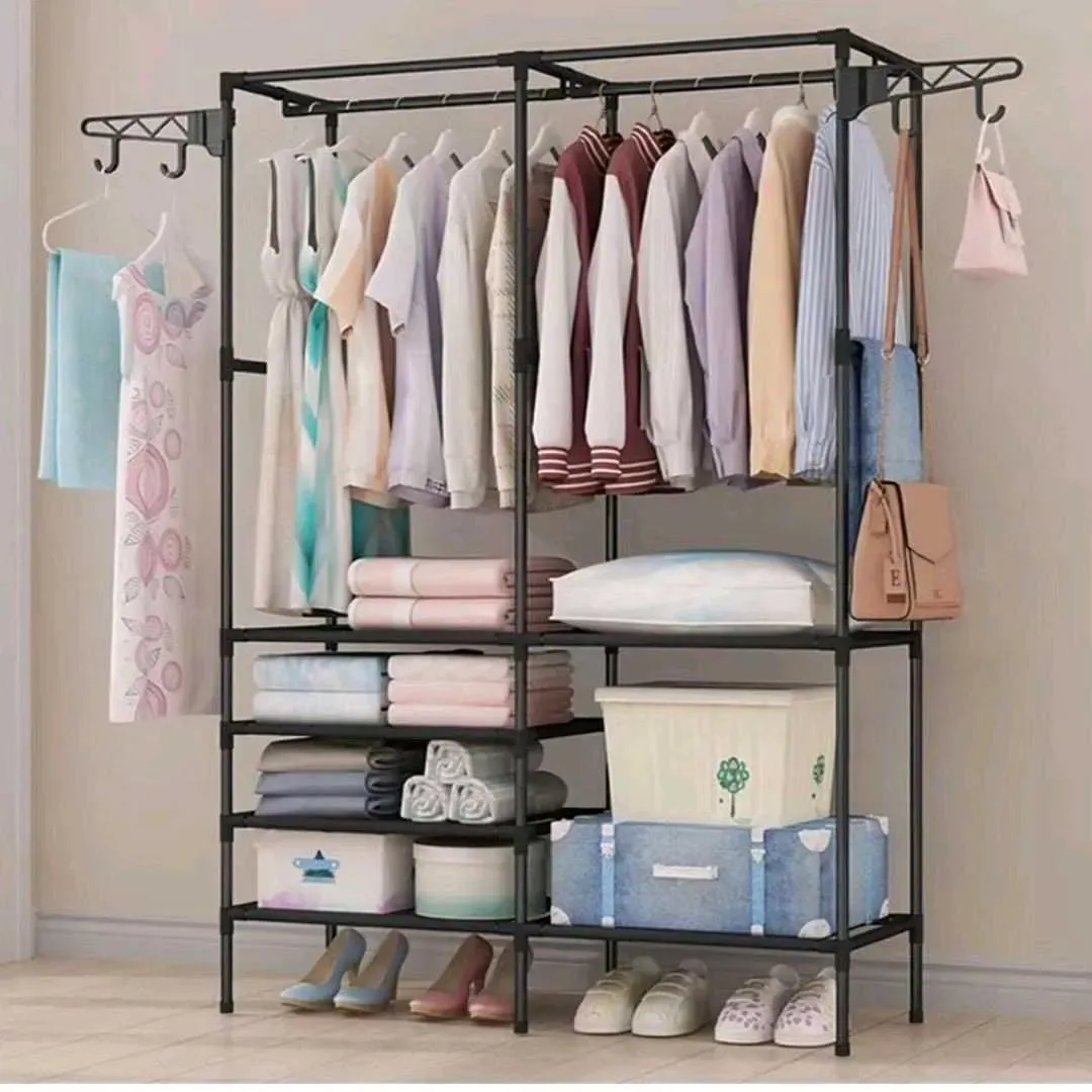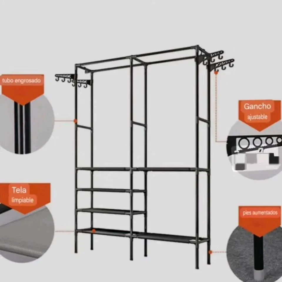 Estante organizador, zapatero y perchero con colgadores de ropas, de dos cuerpos con estantes multifunción.