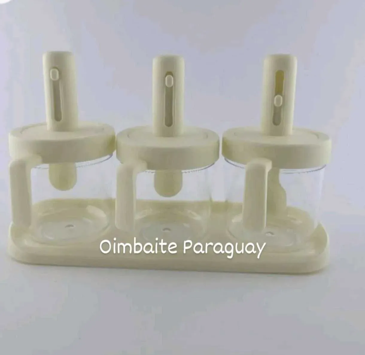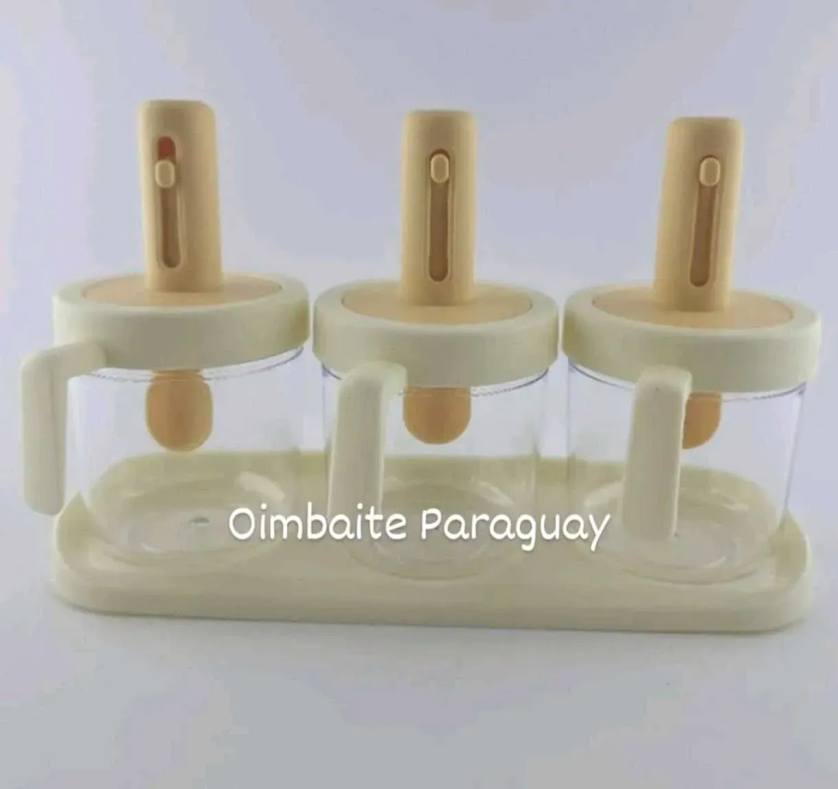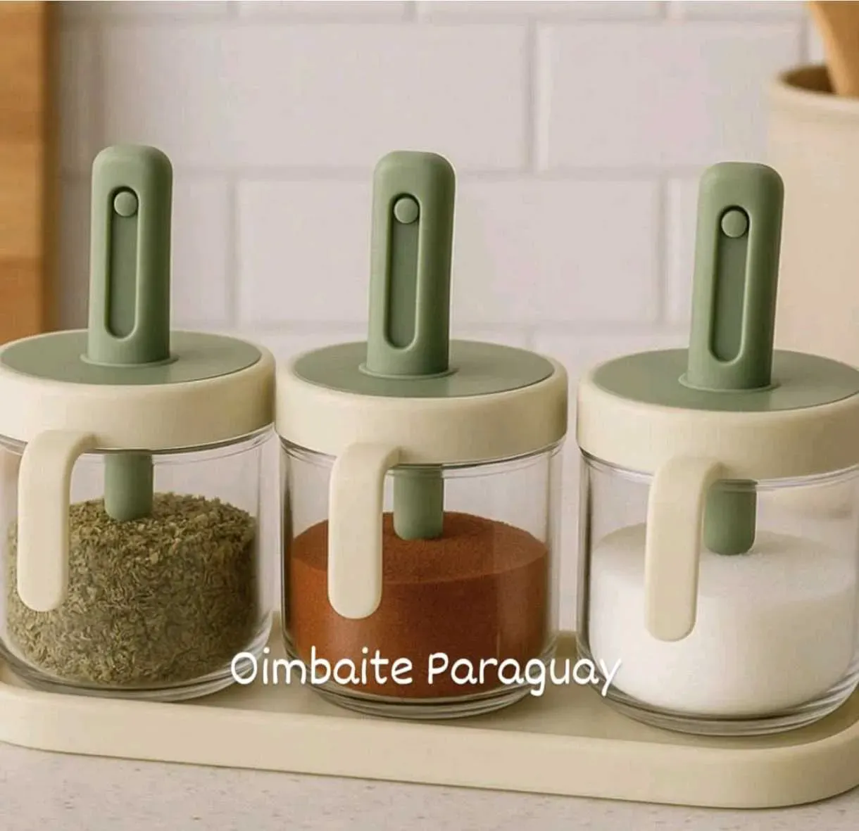 Porta condimentos de 3pcs con bandeja de soporte y cucharas incorporadas.