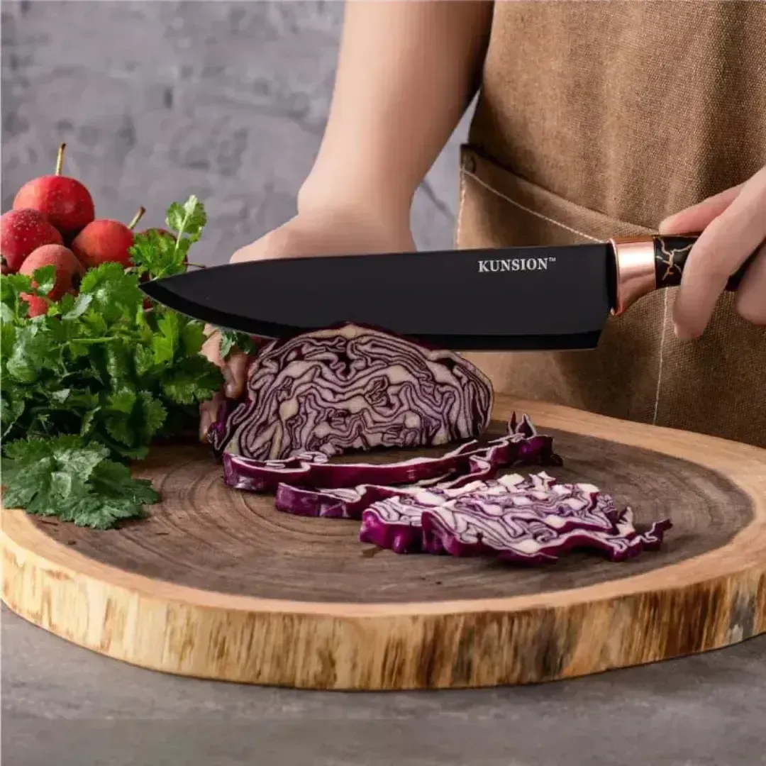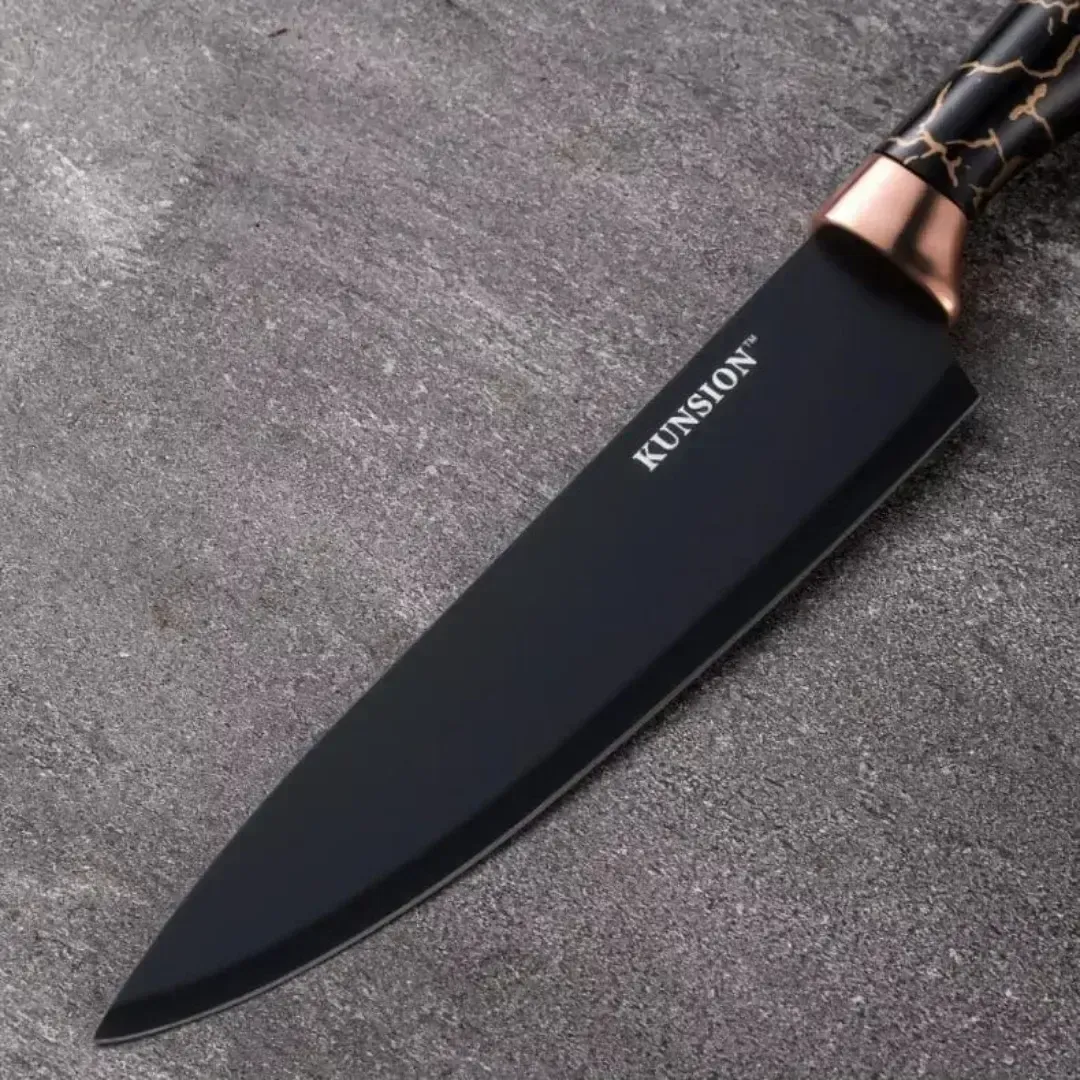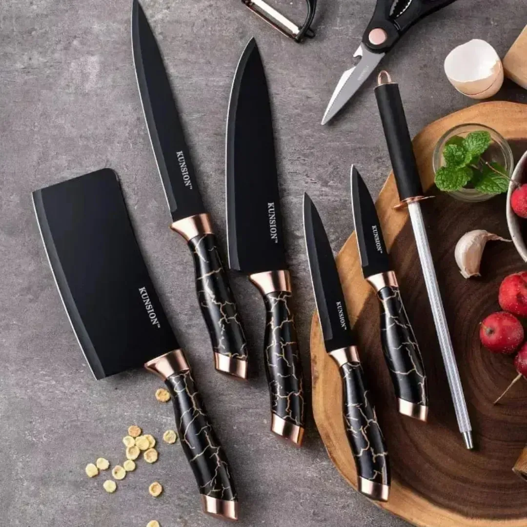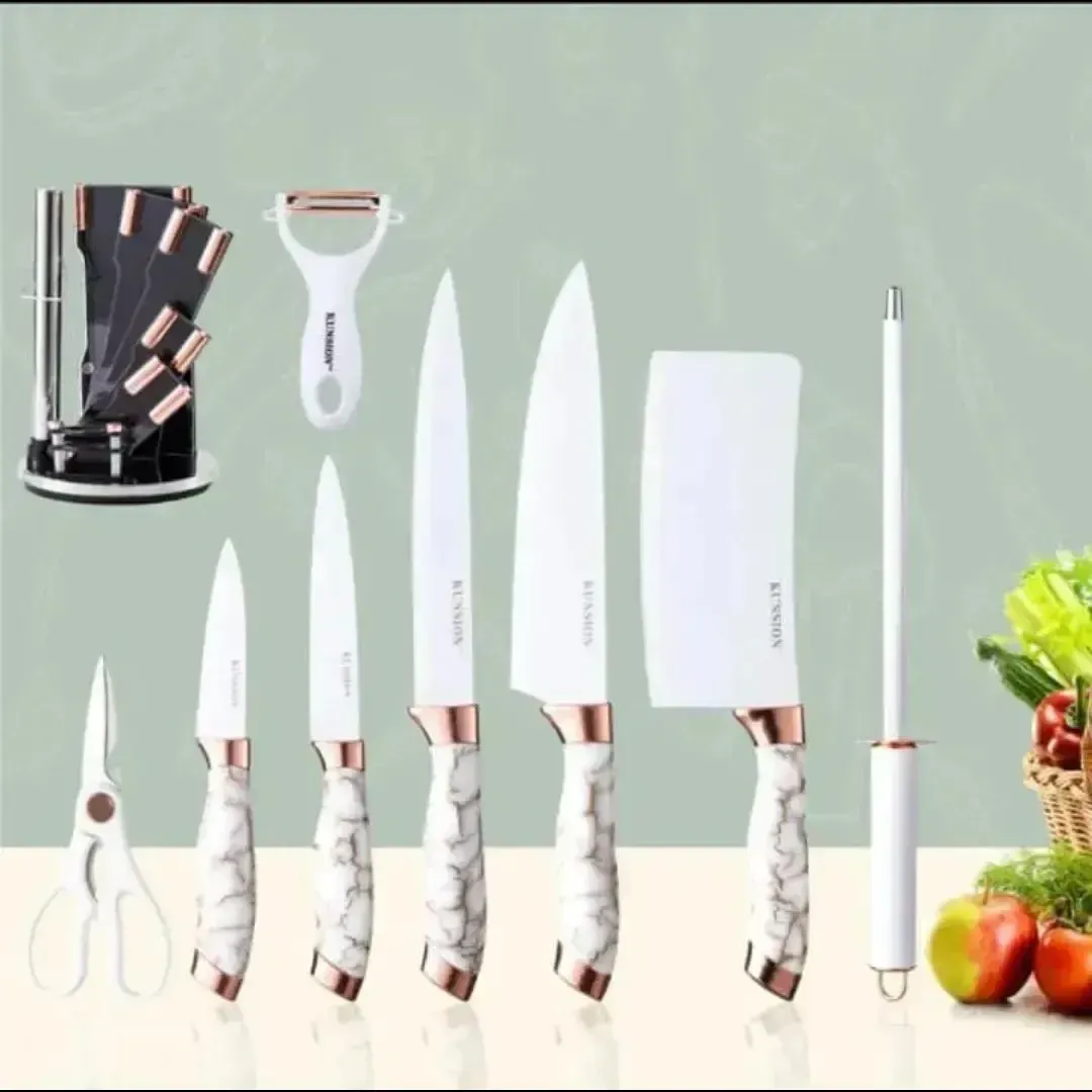 Incluye 5 cuchillos, ,tijera, afilador y pelador de papas.