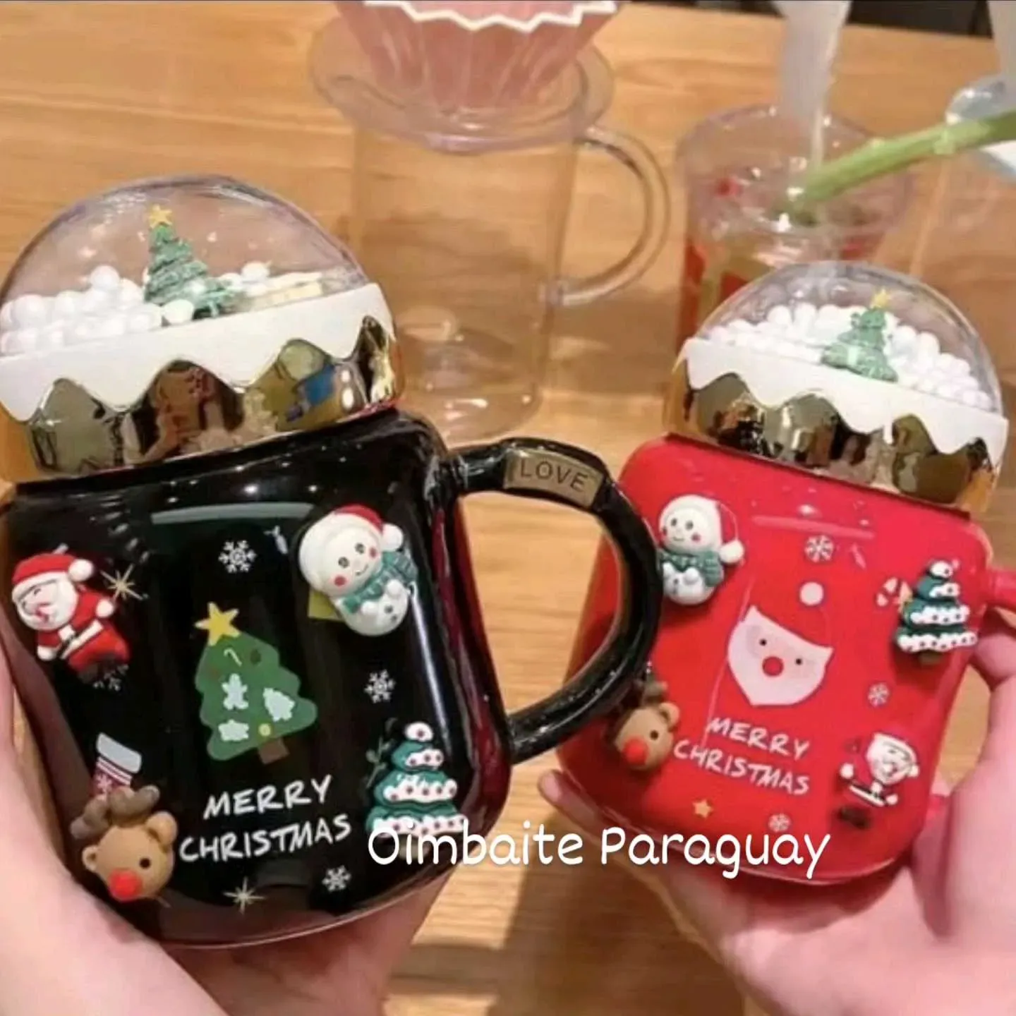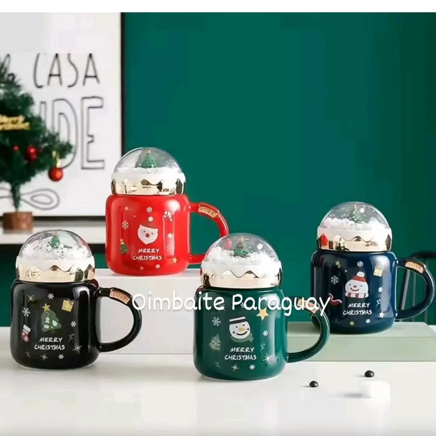 Taza de porcelana diseño navideño, tapa a rosca acrílica